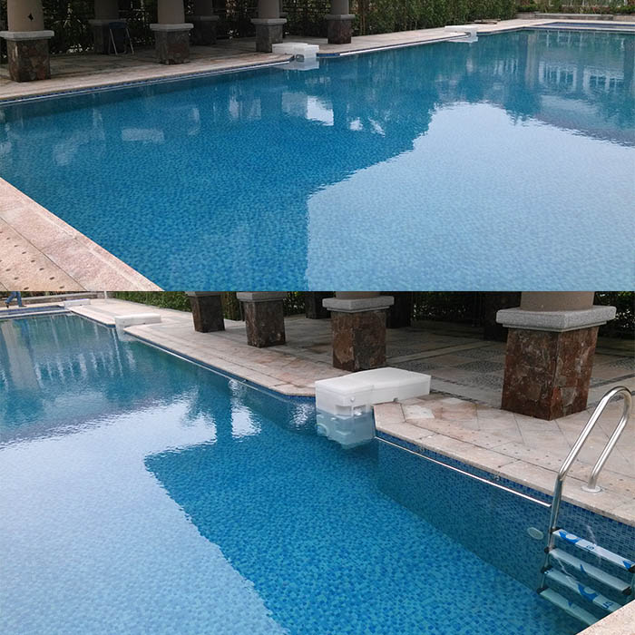 While for the working principle of integrated swimming pool filter ,water is drawn in by the integrated pump and pushed through a pleated fabric cartridge. The cartridge's surface physically traps debris.